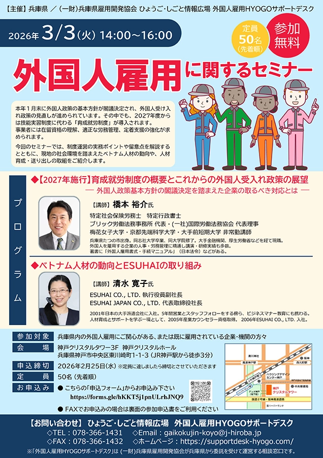 | 参加対象 | 兵庫県内の外国人雇用にご関心がある、または既に雇用されている企業・機関の方々 |